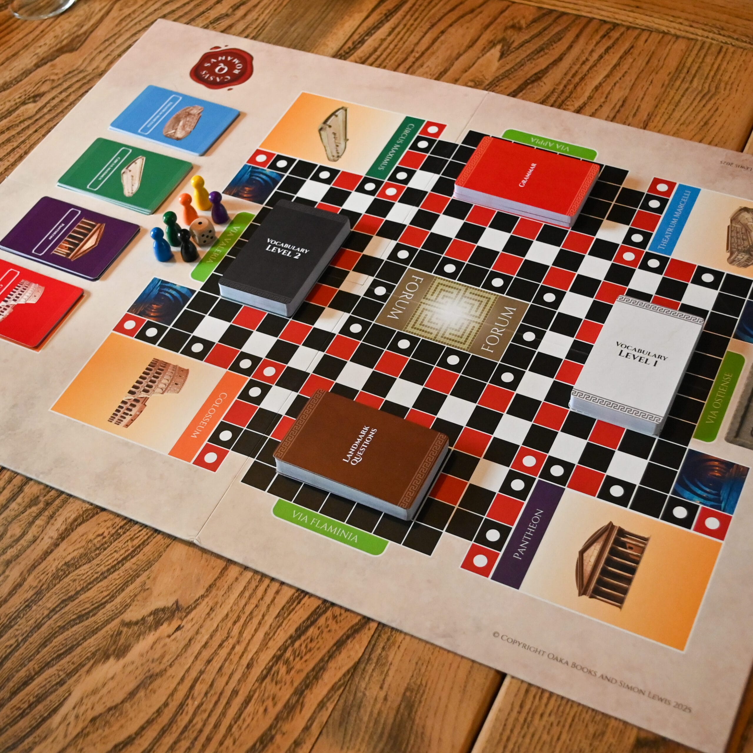 Casus Romanus (Roman Adventure) is a Latin language learning Game for 2-6 players, aged 11 – Adult, created by Simon Lewis & Jeanette Heugh and published by Oaka Books in June, 2025.