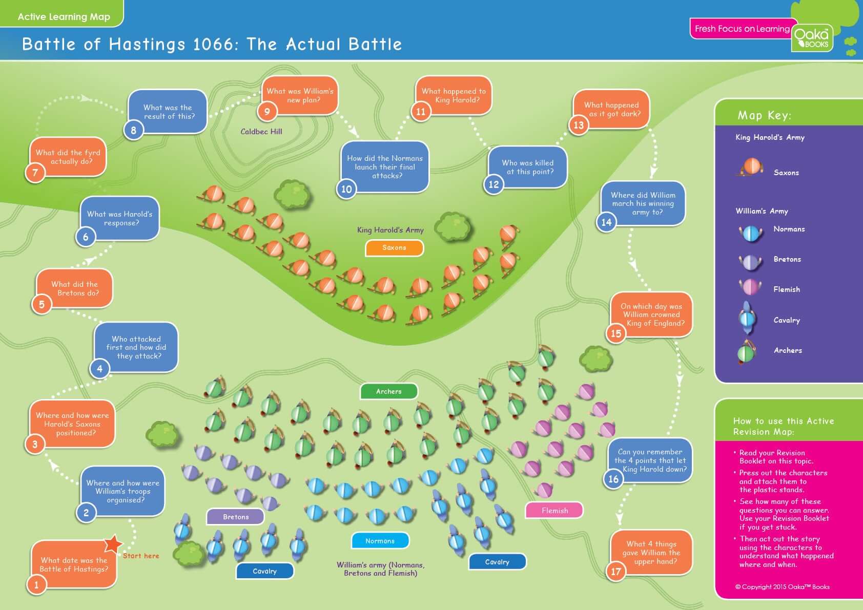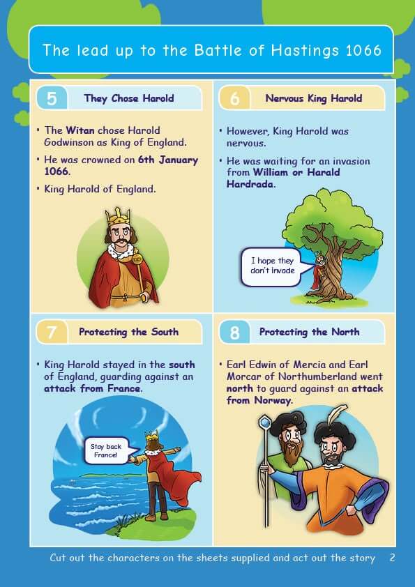 One of the most popular CE and KS3 history topics, the Battle of Hastings is an exciting part of British history. This illustrated topic pack brings the story to life in an easy to read, process and understand format, with beautiful illustrations to highlight each key point. The active learning game and character cards enable pupils to re-enact events, helping them embed the information in their long term memory, essential for exam revision. The all important consequences of the actions of the Witan, King Harold’s preparations for battle, Hardrada’s attack and finally, William’s invasion are all covered with an explanation of why King Harold lost and William won, providing a complete revision guide for this topic at KS3 and CE.