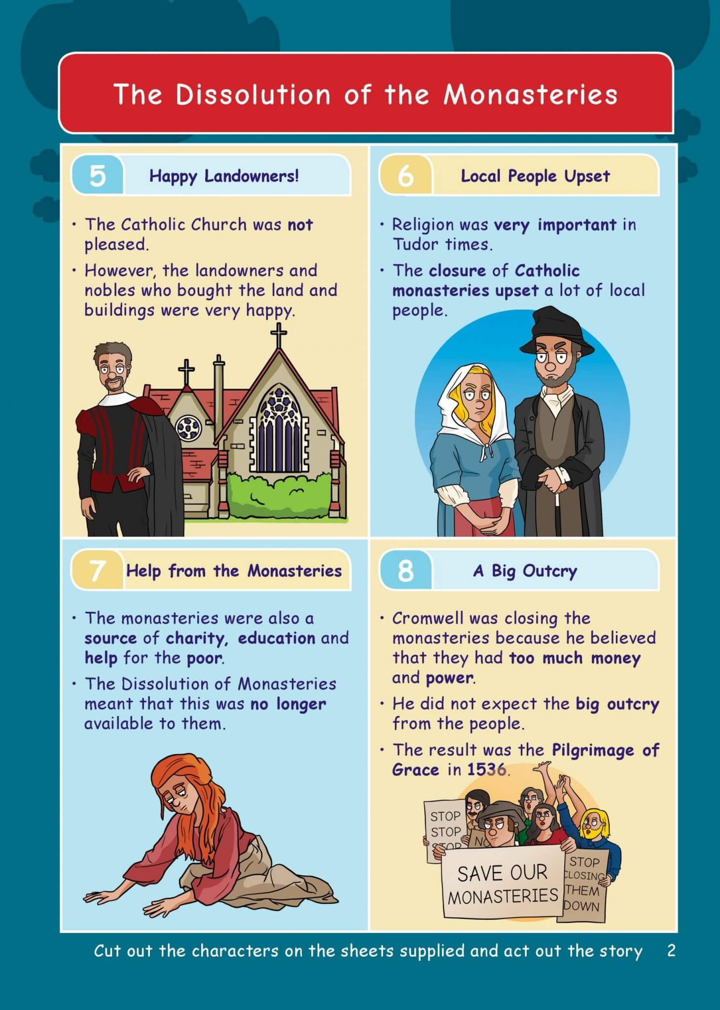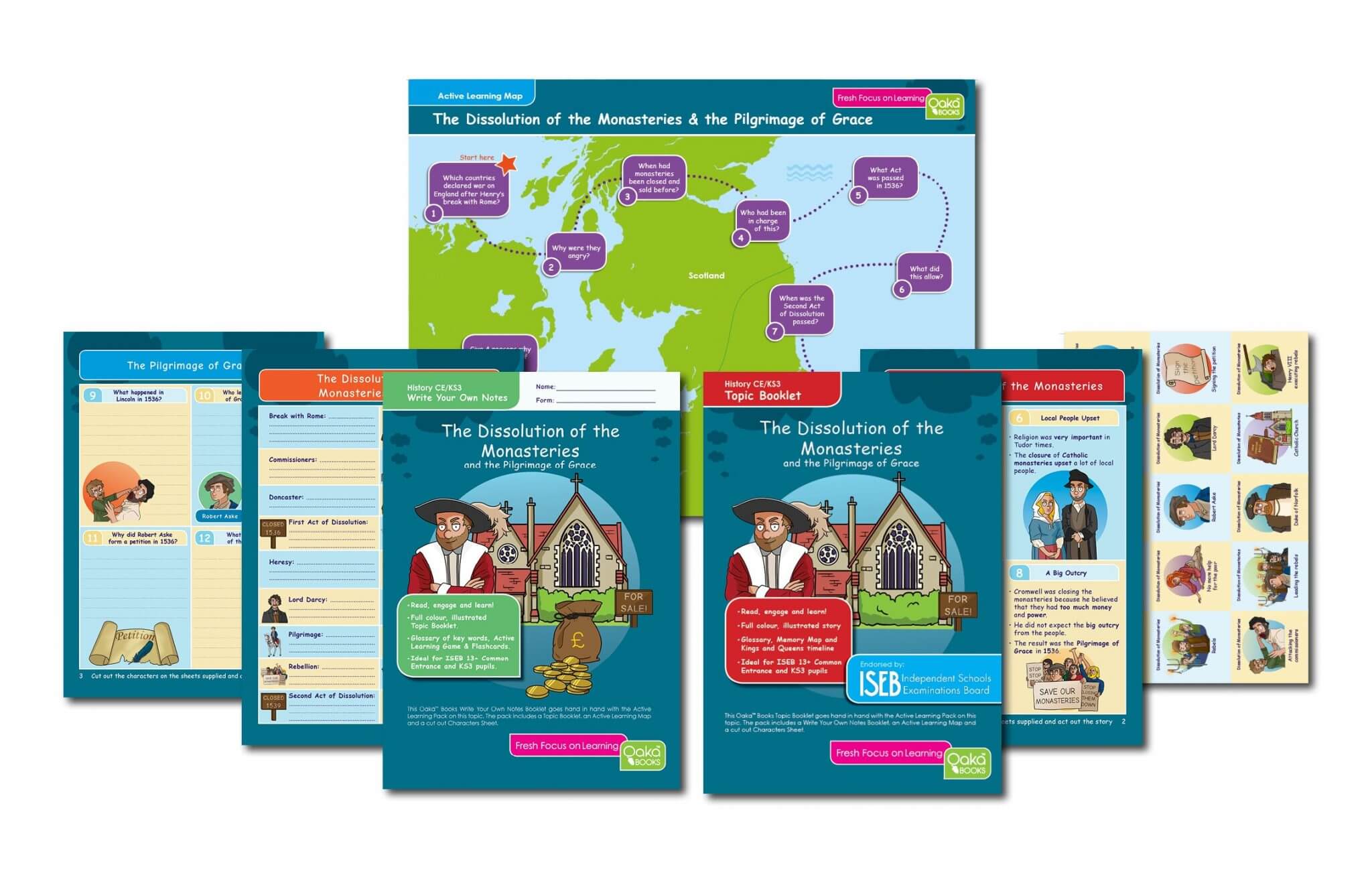 This illustrated pack brings the story of the Dissolution of the Monasteries and the famous Pilgrimage of the Grace to life in an easy to read, process and understand format, with beautiful illustrations to highlight each key point. The active learning game and character cards enable pupils to re-enact events, helping them embed the information in their long term memory, essential for exam revision. The all important causes and consequences of these events provide a complete revision guide for this topic at KS3 and CE.
