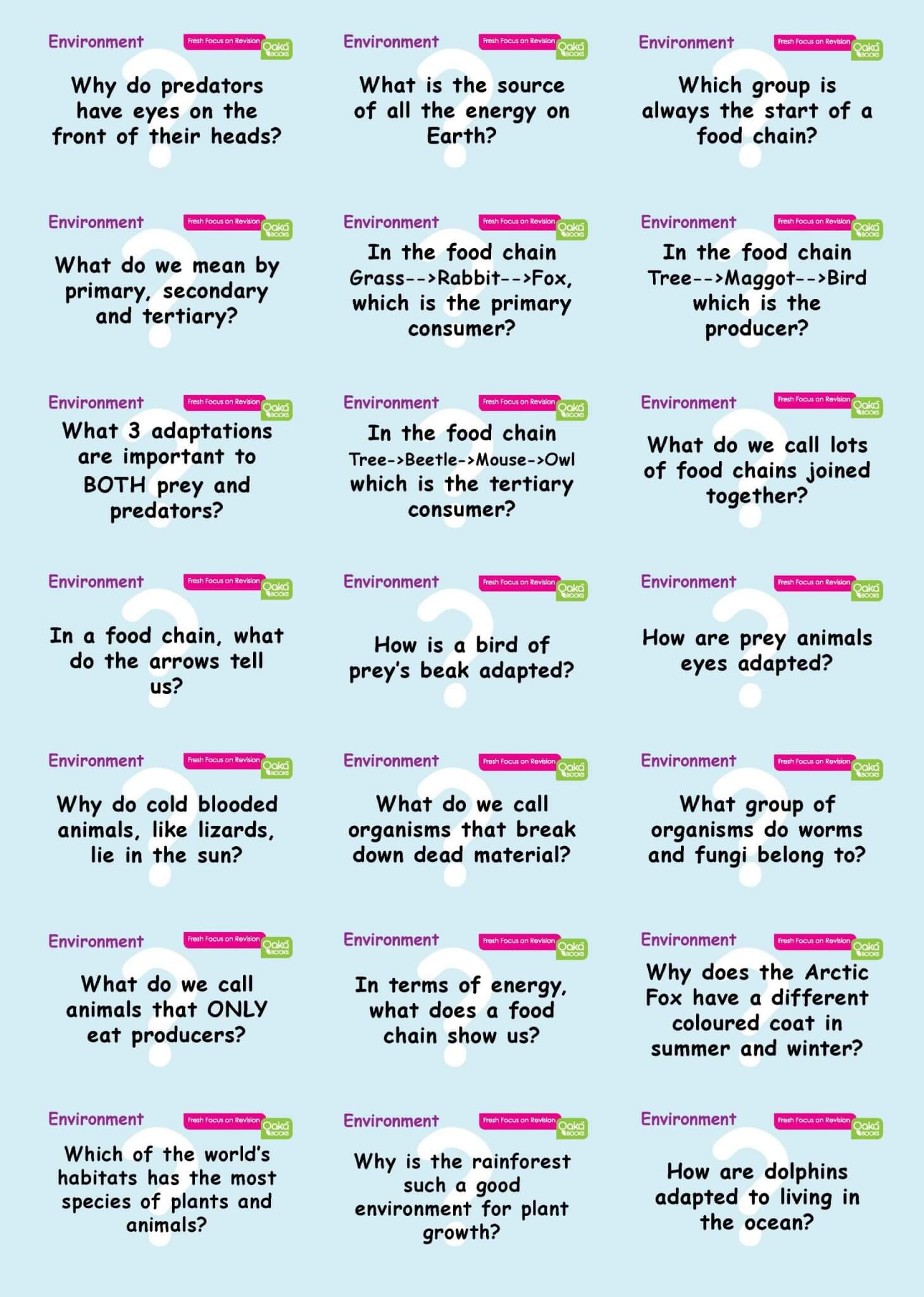 The Environment and Feeding Relationships topic pack explains how plants and animals survive in their environments, their adaptations and how they fit into the food chain. This topic pack uses illustrations and active learning games to ensure that pupils stay engaged and interested. Many science booklets can be a little dull and make children loose interest. However, this topic pack helps retain interest and aids learning effectiveness with its use of information retrieval from memory through the workbook and game.