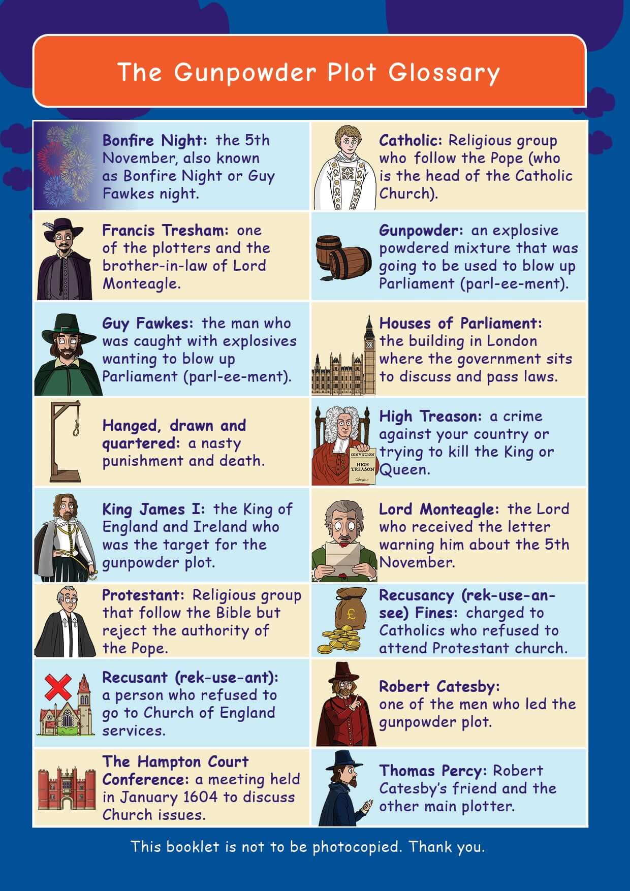 This pack will help your child remember the key people who played roles in the Gunpowder Plot, its causes, why the plot failed and the consequences of the Gunpowder Plot. Arguably one of the earliest acts of terrorism in Britain, the Gunpowder Plot is one of the most well known events in British history.