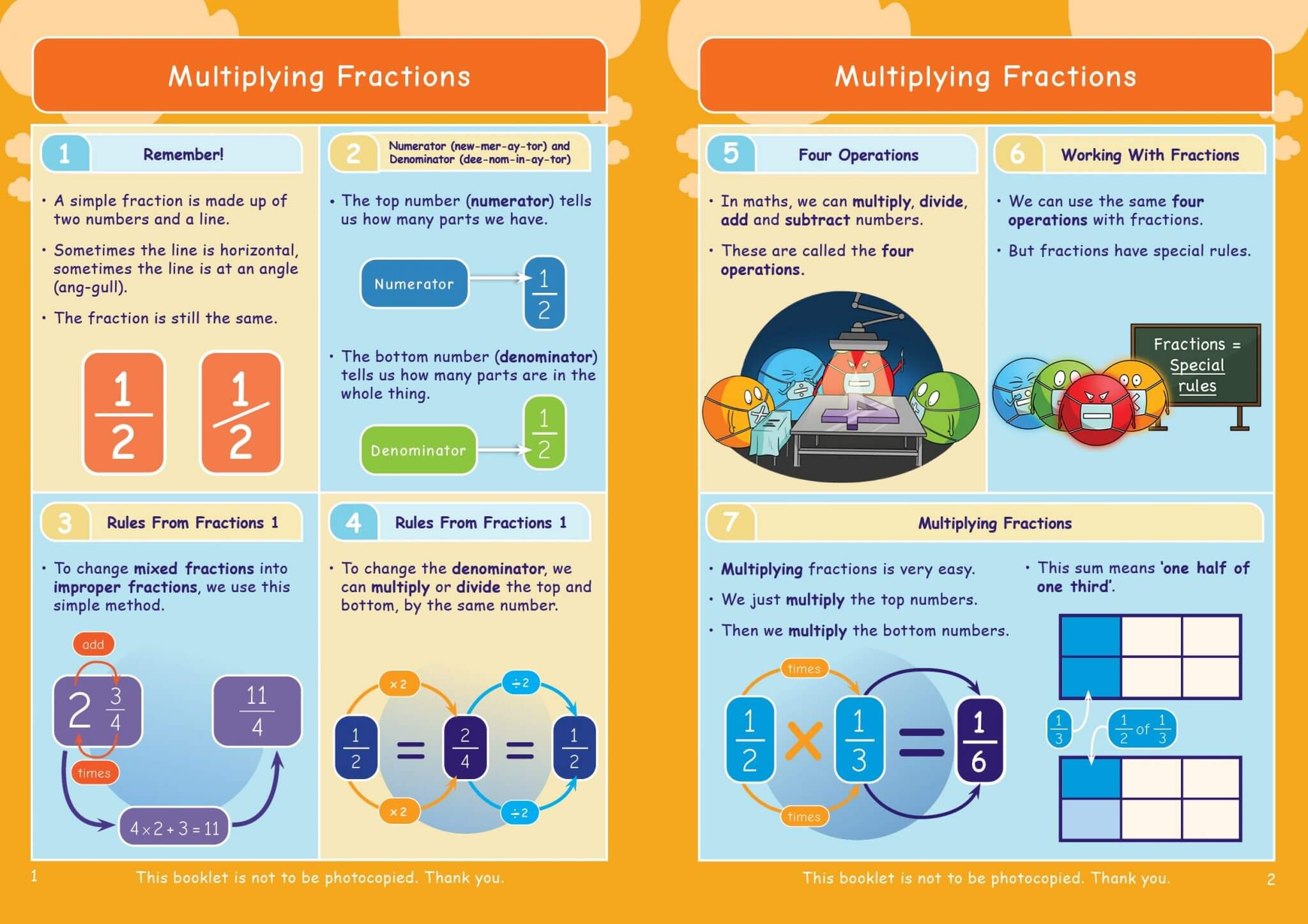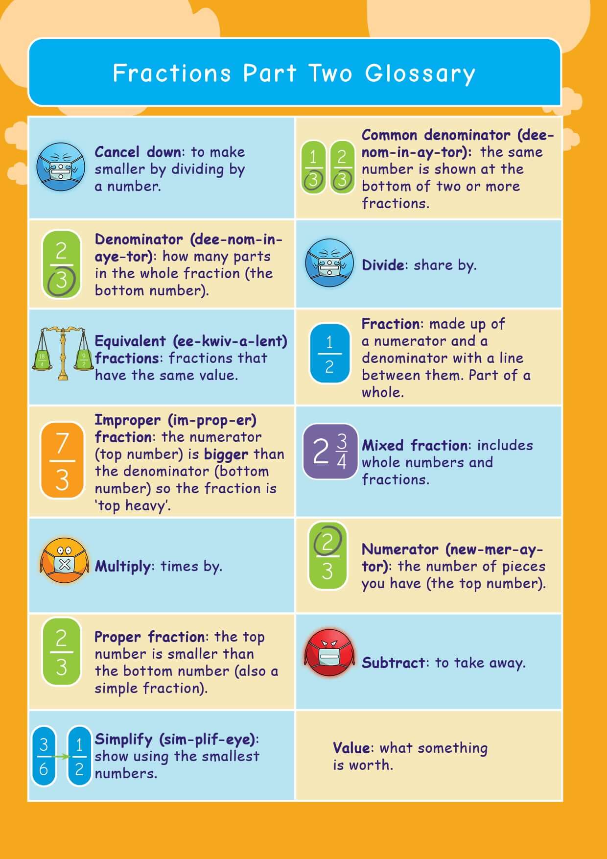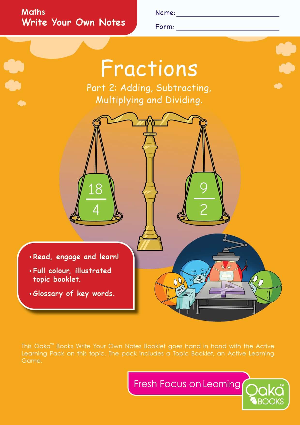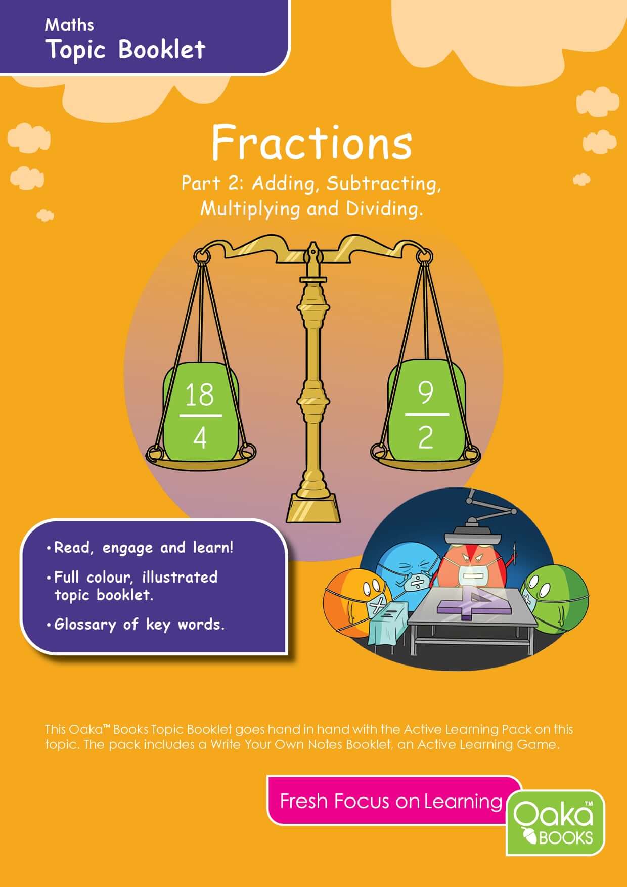 Maths can be a tricky subject. Pupils who ‘miss’ something at the beginning can struggle. Fractions 2 covers how to add, subtract, multiply and divide fractions as well as looking at fractions and their equivalent percentages. Our aim is to produce a set of Maths packs that are clear and simple enough to be used by KS2 children but are not too ‘babyish’ for KS3 (and older teenagers) who need a recap.